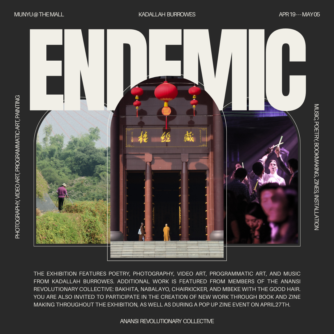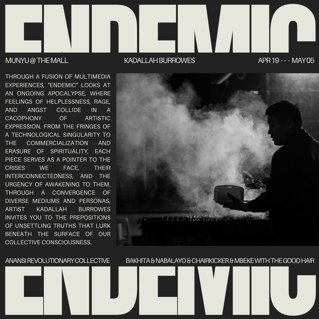 Through a fusion of multimedia experiences, "Endemic" looks at an ongoing apocalypse, where feelings of helplessness, rage, and angst collide in a cacophony of artistic expression. In a convergence of diverse mediums and personas, artist Kadallah Burrowes lays out the crises we face, their interconnectedness, and the urgency of awakening to them. From the fringes of a technological singularity to the commercialization and erasure of spirituality.