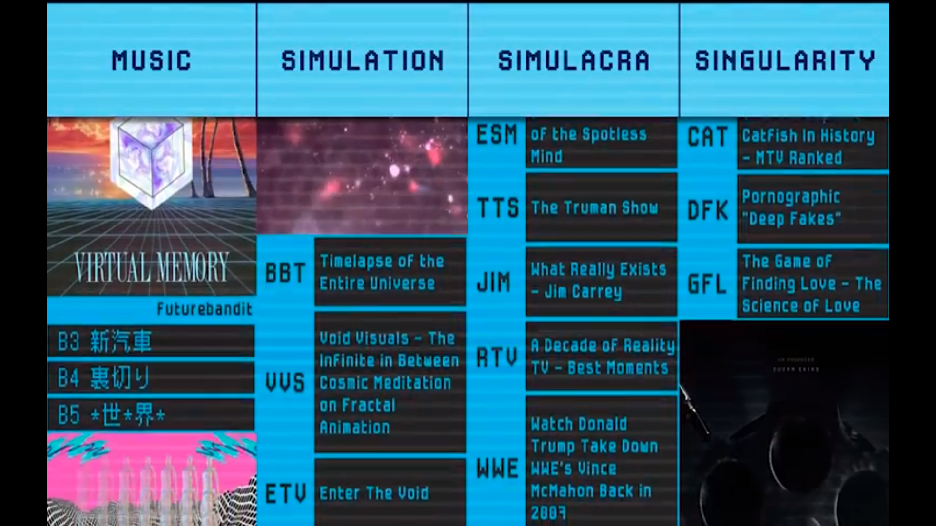 HYPER REEL is a tryptic of generative video collages that explore simulation, simulacra, and the singularity created in Unity. The generative nature of the project ensures that the audience’s experience is different on every viewing. All three sections source hundreds of video clips from movies, television shows, and YouTube videos as well as excerpts of text written by scientists and philosophers alike. Music for the “simulation” section was selected from three albums by futurebandit and worldgrinder.