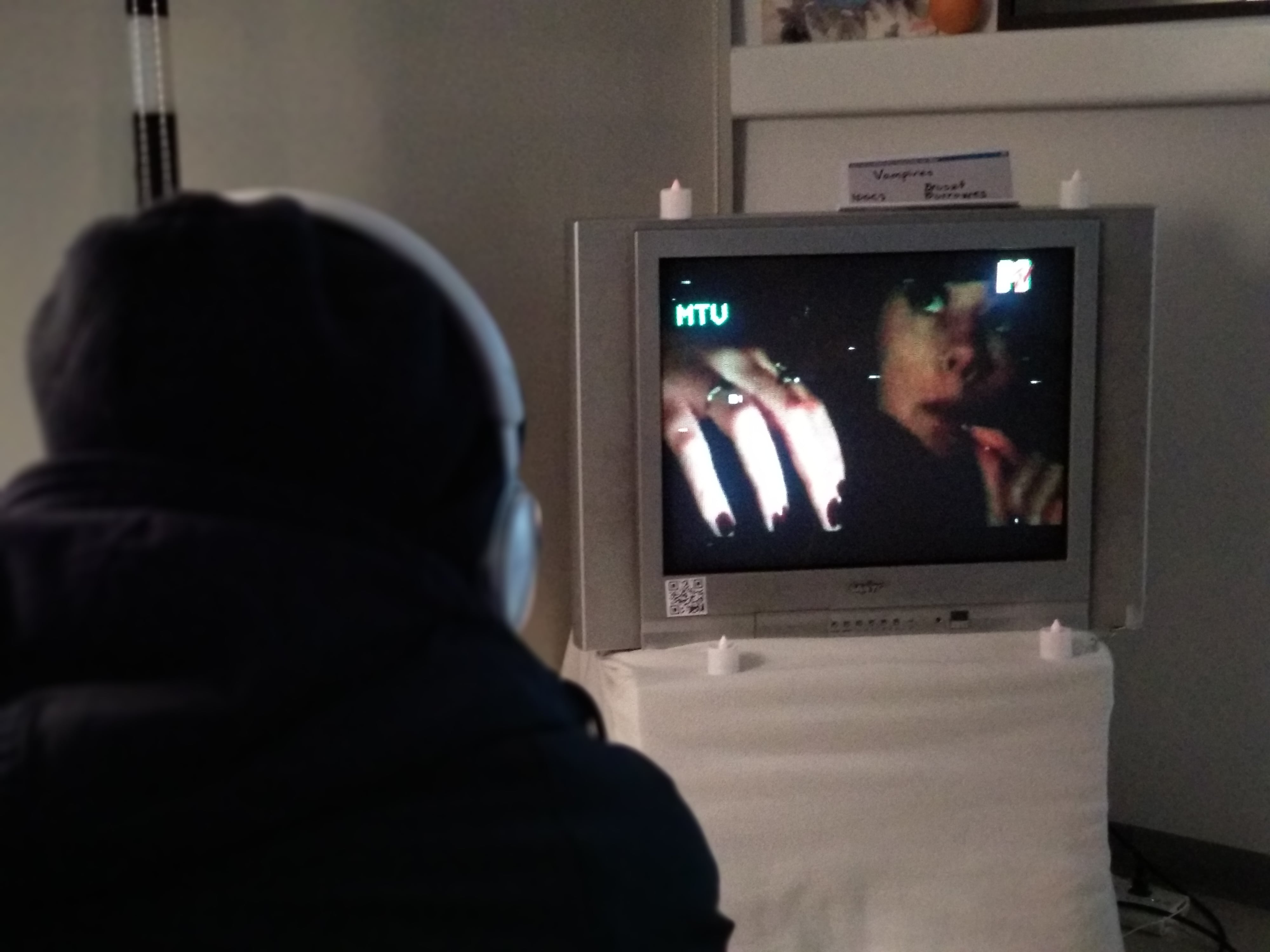 VTV is an installation that blurs the line between reality and fiction; in this case, transporting audience members to a world in which vampires walk the earth alongside humans. However, rather than portraying the undead as horrific demons and bloodthirsty monsters, VTV to humanize them by recontextualizing existing vampire media. The piece was ultimately comprised of the physical installation designed to replicate a living room including a CRT TV and bluetooth remote control, four videos that acted as looping “channels,” and a p5.js sketch that provided the “backend” to the TV interaction.